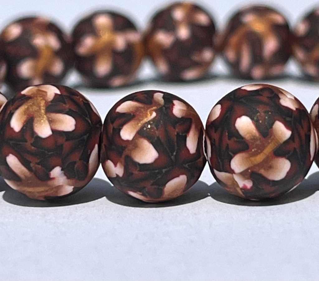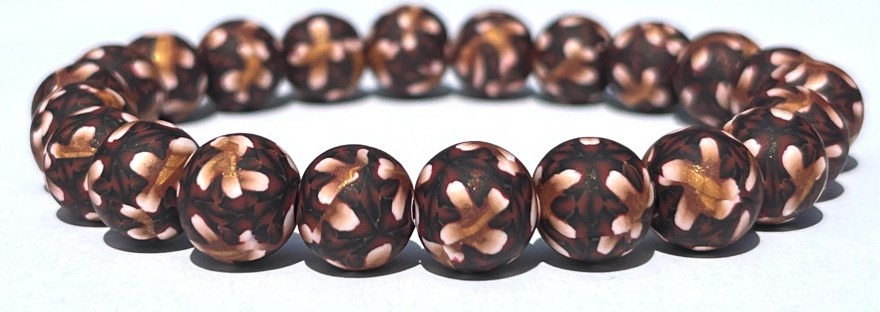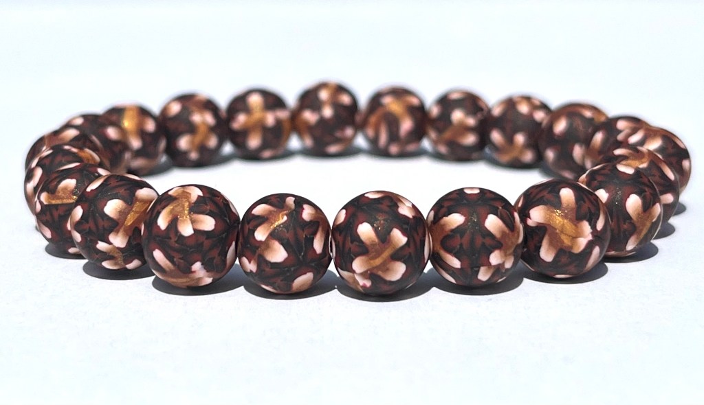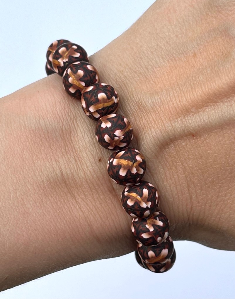 This bracelet features uniquely printed polymer clay beads that include the colors red, black, gold, and white. The polymer clay beads are entirely handmade by me and the design is put in the clay through the time consuming millefiori technique, or “caning”. After I have put the different color clays together in such a way as to make the cane, I then cut thin slices off of the cane and place those slices on a plain clay core bead that I have previously handrolled. The designs are NOT painted on the beads and the beads are strung on jewelers’ elastic.
