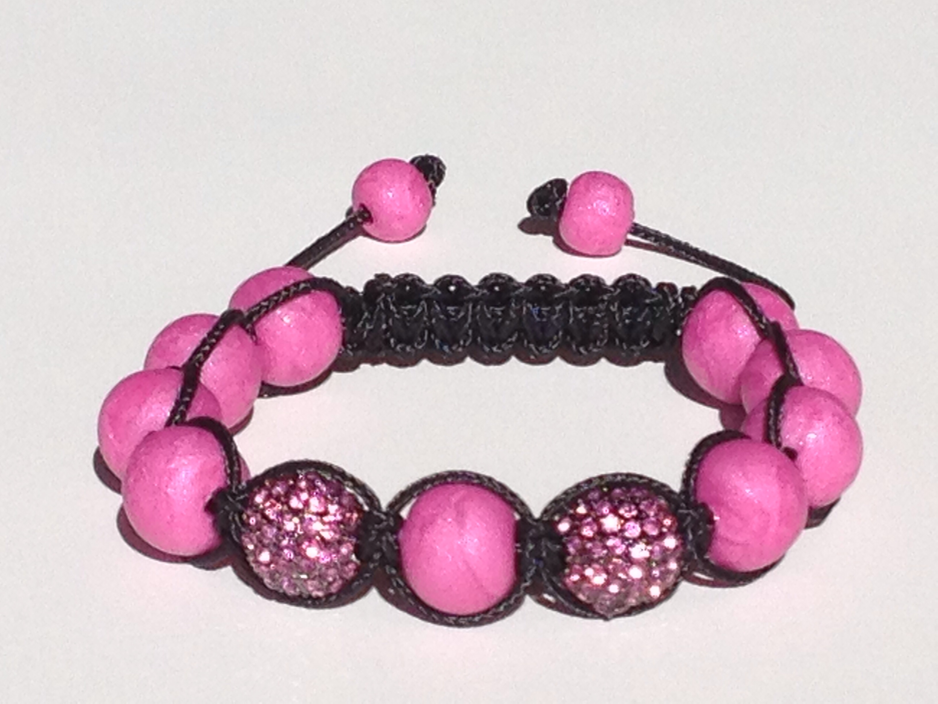“Fuchsia Pink Shamballa” features fuchsia pearl polymer clay beads and two 10mm gun metal plated fuchsia shamballa/pave focal beads.