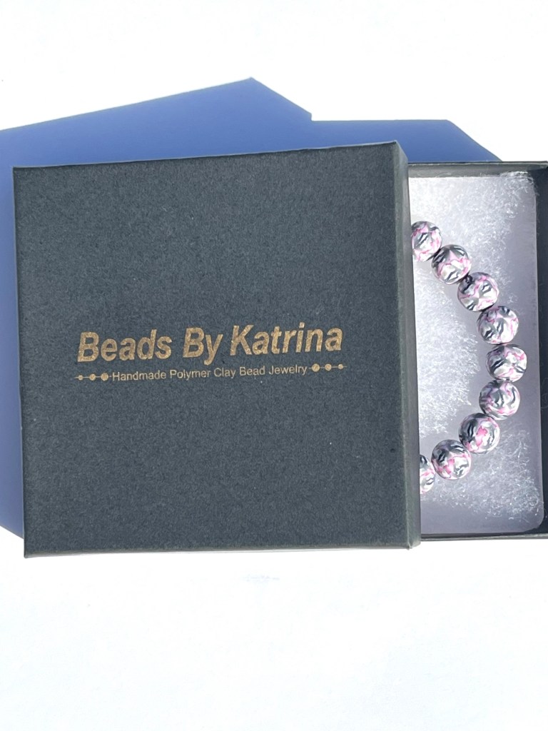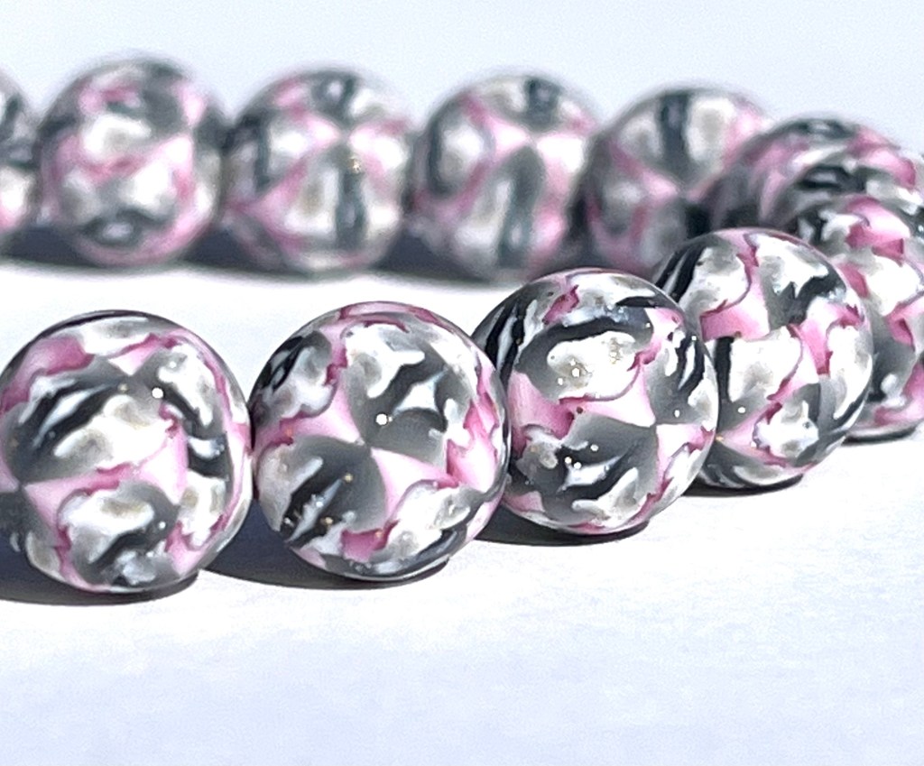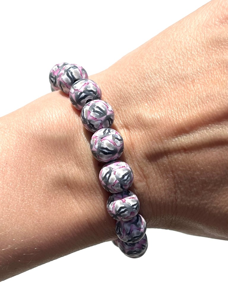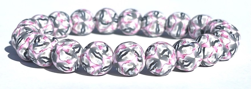This bracelet features uniquely printed polymer clay beads that include the colors yellow, orange, white, and copper. The polymer clay beads are entirely handmade by me and the design is put in the clay through the time consuming millefiori technique, or “caning”. After I have put the different color clays together in such a way as to make the cane, I then cut thin slices off of the cane and place those slices on a plain clay core bead that I have previously handrolled. The designs are NOT painted on the beads and the beads are strung on jewelers’ elastic.