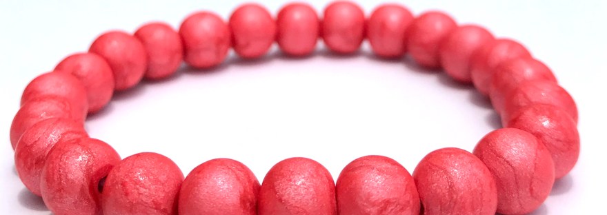 I make the polymer clay beads using the time consuming millefiori, or caning technique. I put different color clay together in such a way to make a “cane” and then cut thin slices off of the cane and roll them onto a core bead that I have previously hand rolled. I then string the beads on jewelers’ elastic.
