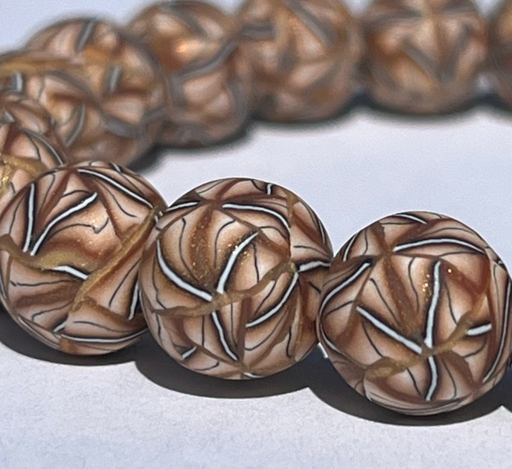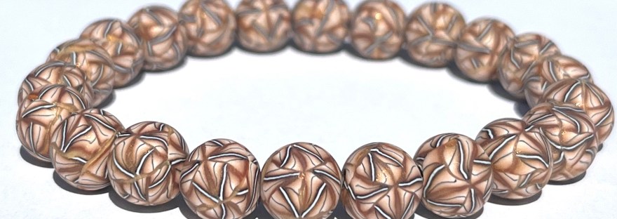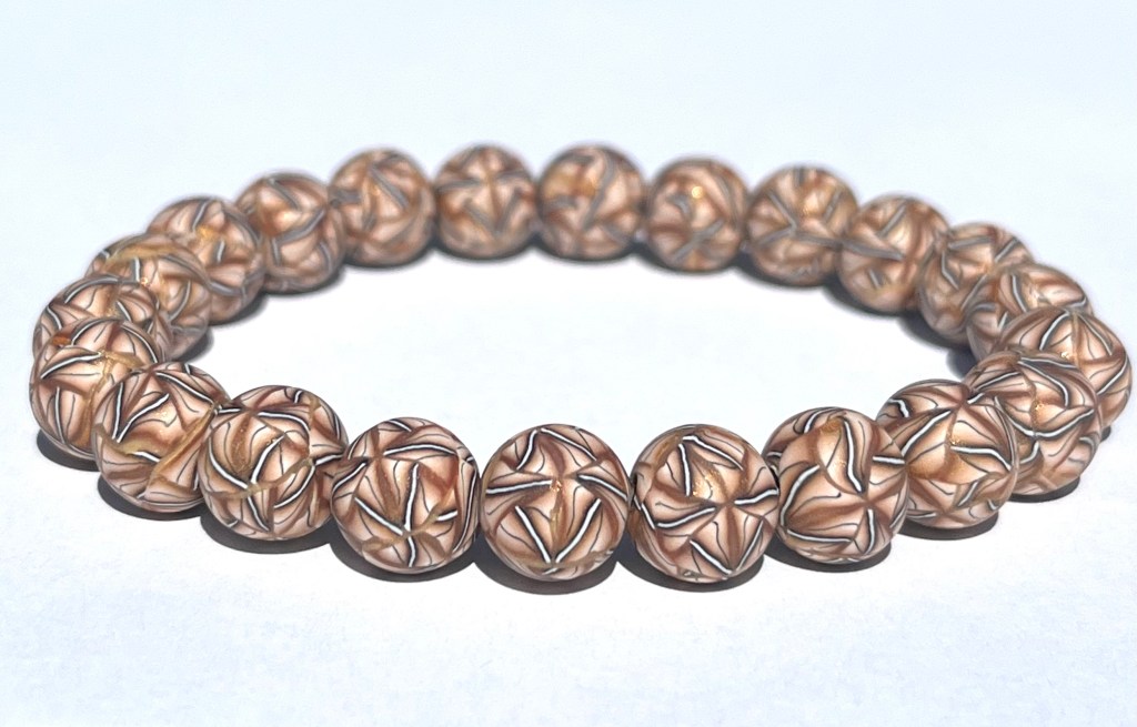 This beautiful bracelet features bronze, gold, pearl, and pewter polymer clay printed beads that were entirely handmade by me.