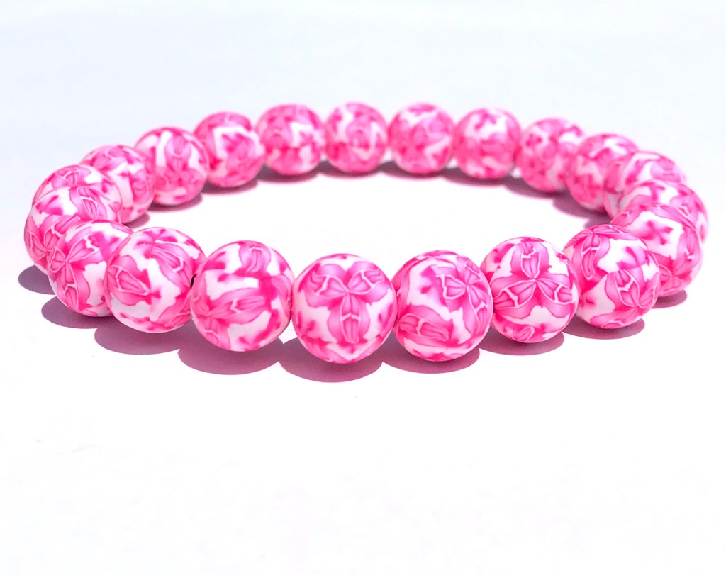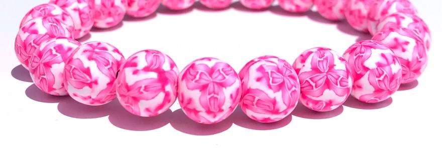 This polymer clay bead bracelet features beads with a unique hot pink and white design. The design is put in the clay through the time consuming millefiori technique, or “caning.” After I have put the different color clays together in such a way as to make the cane, I then cut thin slices off of the cane and place those slices on a plain clay core bead that I have previously handrolled. The designs are NOT painted on the beads and the beads are strung on jewelers’ elastic.