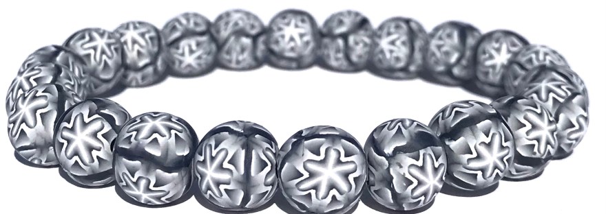This polymer clay bead bracelet features beads with a unique black and white print. The design is put in the clay through the time consuming millefiori technique, or “caning.” After I have put the different color clays together in such a way as to make the cane, I then cut thin slices off of the cane and place those slices on a plain clay core bead that I have previously handrolled. The designs are NOT painted on the beads and the beads are strung on jewelers’ elastic.